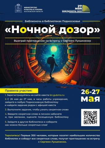 Министерство культуры и туризма Московской области совместно с библиотеками Подмосковья приглашают отметить 12-ю ежегодную акцию «Библионочь» и принять участие в квесте «Ночной дозор», который пройдет в регионе 26-27 мая.