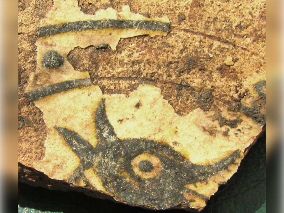 Раскопки на Звенигородском Городке, у стен Успенского собора, позволили археологам сделать редкую находку. Здесь были найдены фрагменты поливной восточной чаши золотоордынской эпохи, на дне которой изображен змей или дракон.