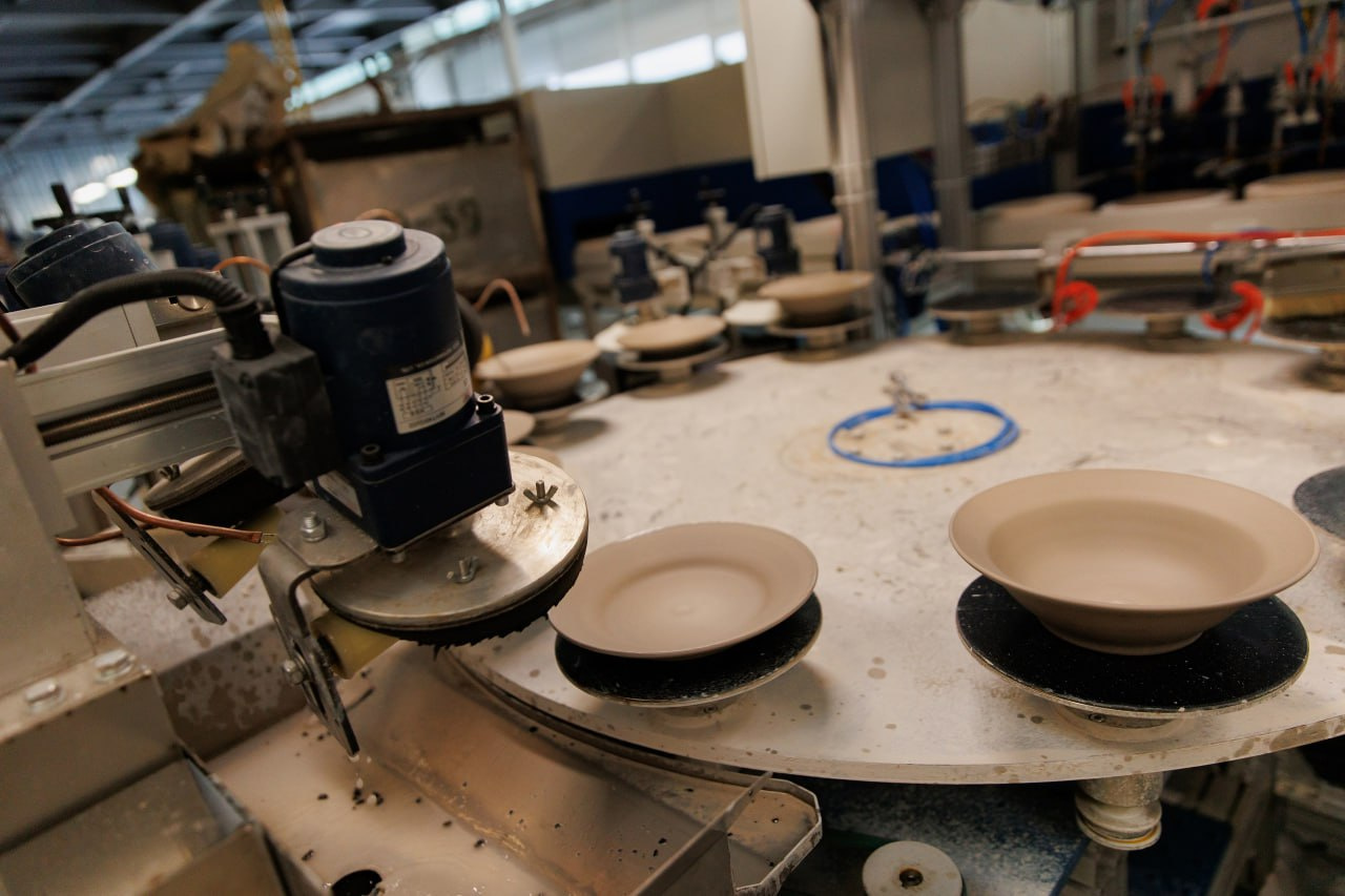 Продолжает модернизацию Дулёвский фарфоровый завод и сейчас запускают новую линию по формовке плоских изделий (тарелок, блюдец и пиал). Она сможет заменить сразу четыре поста, где работает по три человека.