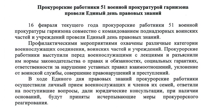 Информируем лыткаринцев, что прокурорские работники 51 военной прокуратурой гарнизона провели Единый день правовых знаний
