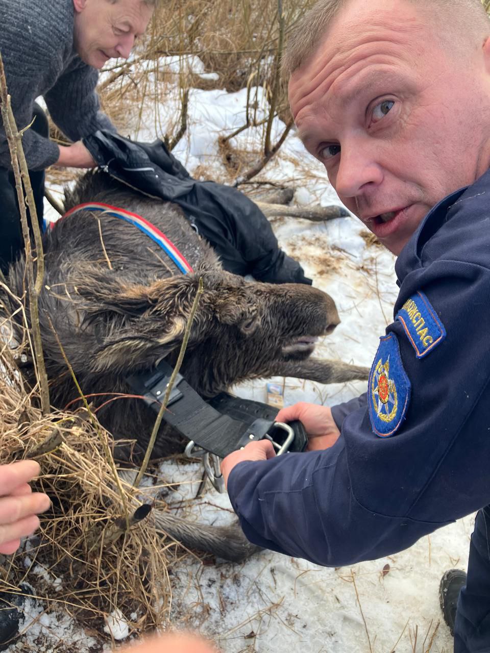 К счастью, местные жители заметили бедолагу и вызвали спасателей. Прибыв по указанным координатам, работники дежурной смены накинули трос на шею животного и вместе с неравнодушными людьми вытянули лосиху на берег. Ко всеобщей радости выяснилось, что спасли не одну, а целых две жизни – лосиха оказалась беременная. Участники спасательной операции укрыли будущую мамочку термоодеялом и массировали замерзшее животное, чтобы восстановить кровообращение, а когда убедились, что лосиха пришла в себя и может самостоятельно передвигаться, отпустили в ее естественную среду обитания.
