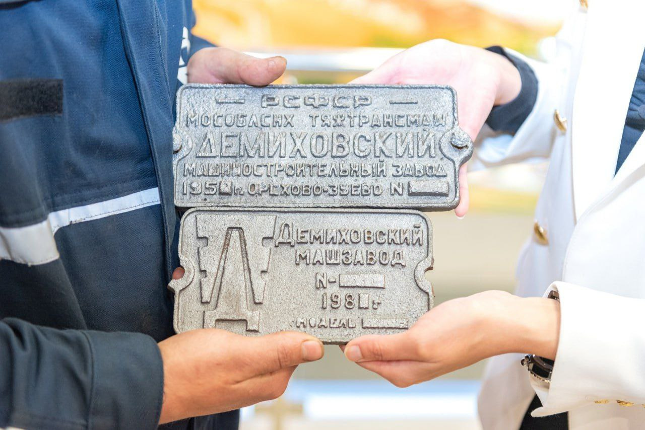 Слесарь механосборочных работ цеха №14 Евгений Добрынин передал Выставочному центру ДМЗ две фирменные заводские таблички 1950-х и 1980-х годов выпуска. Они представляют собой металлические отливки прямоугольной формы с рельефными надписями «Демиховский машиностроительный завод» и «Демиховский машзавод».
